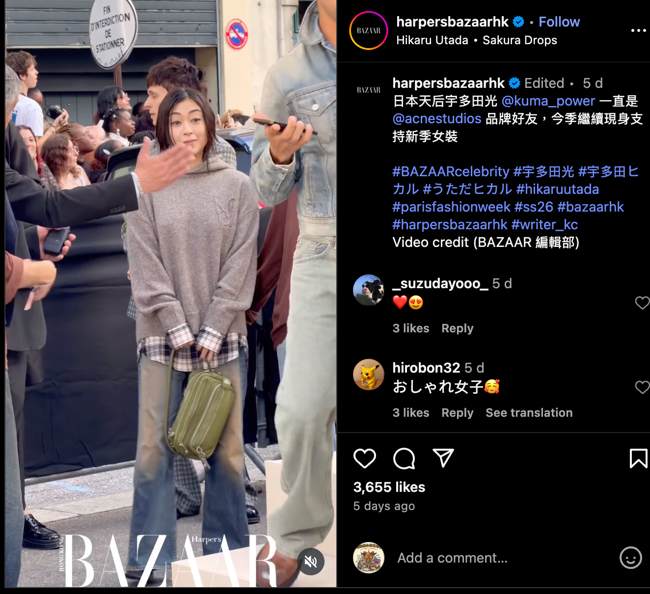 宇多田光參加時尚秀,看起來像跟朋友逛街到一半,看到超市白菜特價跟著去排隊的日本地方媽媽。[IG]